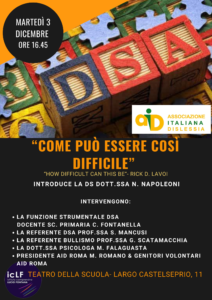 Evento di sensibilizzazione sui Disturbi Specifici dell'Apprendimento martedì 3 dicembre 2024 ore 16:45 presso il teatro della scuola Largo Castelseprio 11